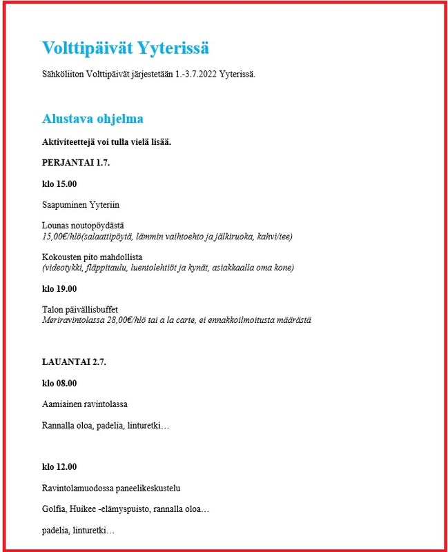 1.-3.7.2022 Volttipäivät taas Yyterissä Osasto maksaa jäsenilleen + avec illalliskortit lauantain juhlaillalliselle. Ilmottautumiset illallistilaisuuteen 16.6 mennessä Matti Kivelä 050 4664905
